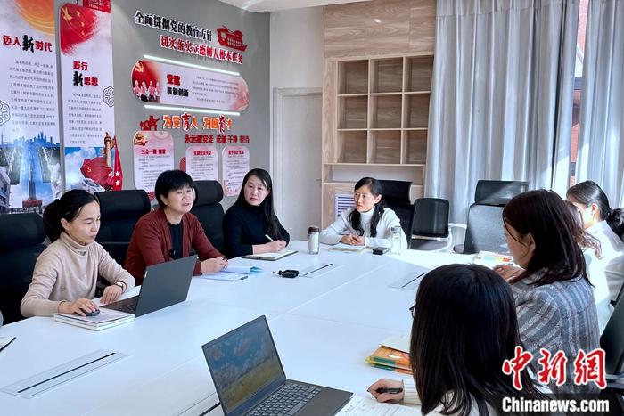 全國人大代表、寧夏銀川市二十一小學(xué)黨總支書記馬恒燕(左二)與銀川市二十一小學(xué)健康城分校教師交流。 李佩珊 攝