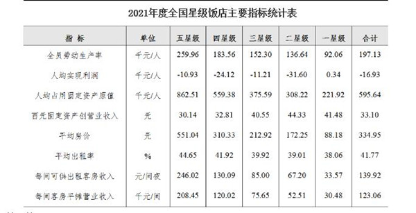 根據(jù)“2021年度全國星級飯店主要指標(biāo)統(tǒng)計(jì)表 ”,平均房價(jià)為334.95元,每間可供出租客房收入為139.92元/間夜,每間客房平攤營收為123.06千元/間。