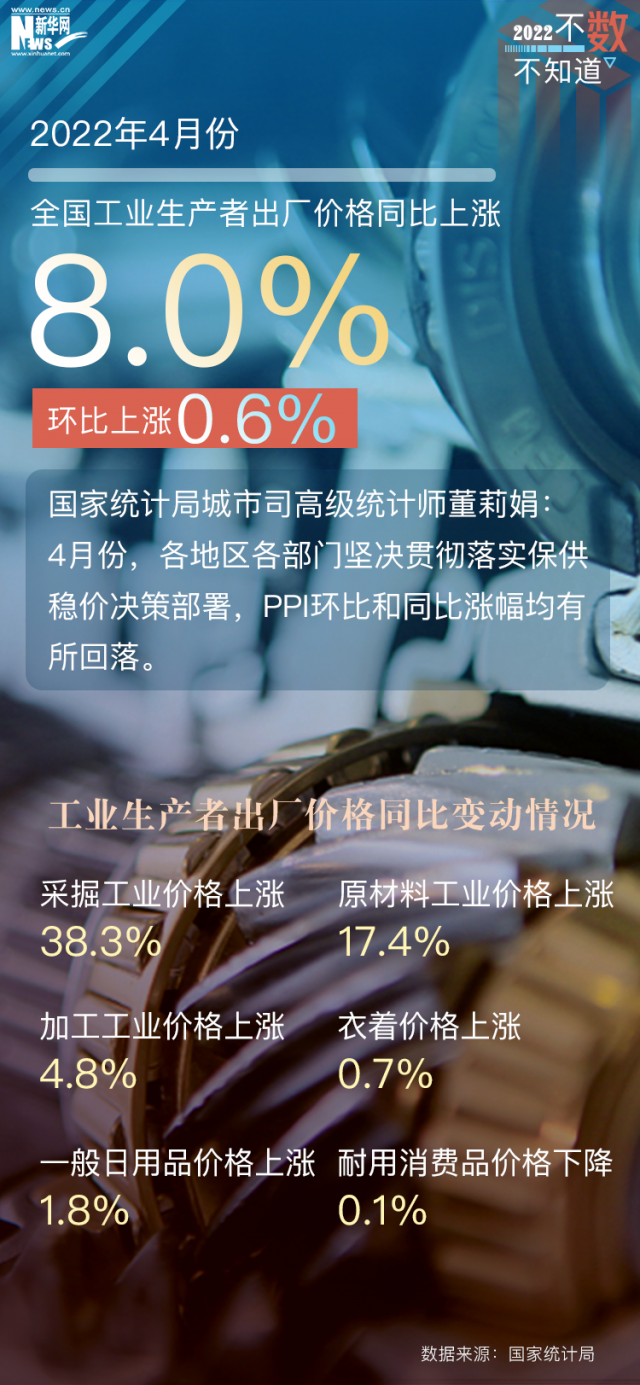 從全國(guó)工業(yè)生產(chǎn)者出廠價(jià)格指數(shù)(PPI)看,盡管?chē)?guó)際大宗商品價(jià)格高位運(yùn)行,但各地區(qū)各部門(mén)貫徹落實(shí)保供穩(wěn)價(jià)決策部署,4月份PPI同比上漲8%,漲幅比上月回落0.3個(gè)百分點(diǎn)。