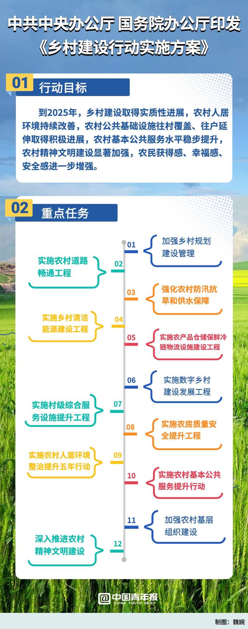 中國青年報客戶端訊(中青報·中青網記者 魏婉)中共中央辦公廳、國務院辦公廳近日印發(fā)的《鄉(xiāng)村建設行動實施方案》提出,到2025年,鄉(xiāng)村建設取得實質性進展,農村人居環(huán)境持續(xù)改善,農村公共基礎設施往村覆蓋、往戶延伸取得積極進展,農村基本公共服務水平穩(wěn)步提升,農村精神文明建設顯著加強,農民獲得感、幸福感、安全感進一步增強。