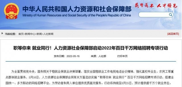 近日,人力資源和社會保障部會同有關方面啟動實施“職等你來 就業(yè)同行”百日千萬網(wǎng)絡招聘專項行動,搭建全國統(tǒng)一、多方聯(lián)動的網(wǎng)絡招聘平臺。行動將持續(xù)至8月25日,預計提供超千萬個就業(yè)崗位。此次專項行動主會場設在:中國公共招聘網(wǎng)、中國國家人才網(wǎng)、“就業(yè)在線”,并開設就業(yè)導引地圖,鏈接各省招聘分會場和相關社會參與方。