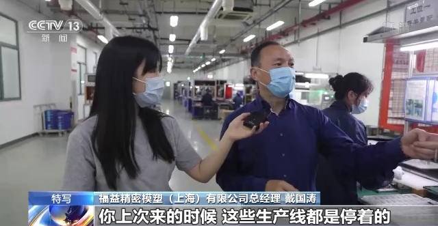 福益精密模塑(上海)有限公司總經(jīng)理 戴國(guó)濤:你上次來(lái)的時(shí)候這些生產(chǎn)線都是停著的,今天我們都已經(jīng)正常生產(chǎn)了。直到目前,我們是24小時(shí)開(kāi)工在加足馬力,所有的情況都在往好的方向轉(zhuǎn)。