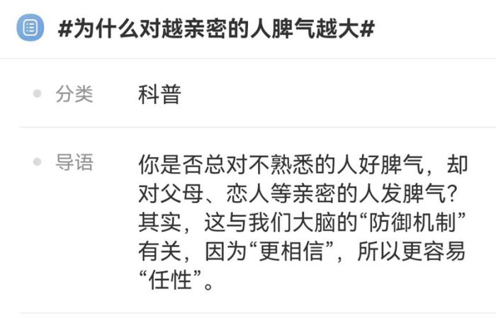 心理咨詢師楊琳瓊分析,潛意識中,我們知道對親近的人發(fā)脾氣會遭遇什么,這個風險是可以接受的,并且這種親密關系不會因此而摧毀。