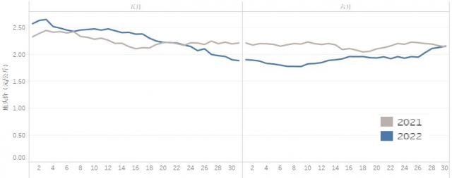 從價(jià)格走勢看(圖1),呈現(xiàn)三個(gè)特點(diǎn):一是整體處于低價(jià)區(qū)間。6月是我國露地蔬菜生產(chǎn)旺季,全國平均氣溫、平均降水量較常年同期偏高,平均日照時(shí)數(shù)較2021年偏多,整體有利于蔬菜生產(chǎn),供應(yīng)較為充足,月均地頭價(jià)環(huán)比、同比均呈下降態(tài)勢。二是月內(nèi)上旬呈下降趨勢。6月9日蔬菜地頭價(jià)1.78元/公斤,較月初1.90元/公斤下降了6.3%,跌至2022年以來的最低點(diǎn),比年內(nèi)最高價(jià)(4.21元/公斤)下降57.7%。三是中下旬價(jià)格止跌回升。經(jīng)歷6月10—16日和26—30日兩輪較大幅度上漲,月末價(jià)格達(dá)到2.16元/公斤,比6月9日價(jià)格上升了21.3%。上漲主要原因:一方面,黃淮海及環(huán)渤海等地區(qū)因持續(xù)高溫天氣,設(shè)施蔬菜提前拉秧,供應(yīng)量減少。另一方面,南方持續(xù)降雨影響蔬菜正常生長和采收,江西、湖南、廣西、福建等省部分地區(qū)發(fā)生不同程度洪澇災(zāi)害,100多萬畝蔬菜受災(zāi)。此外,受疫情影響的社會(huì)性消費(fèi)開始復(fù)蘇,蔬菜需求量增加。
