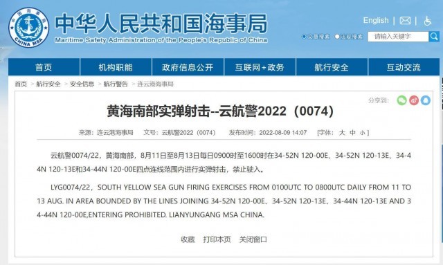 江蘇連云港海事局日前發(fā)布航行警告,今起(8月11日)至13日每日9時至16時在黃海南部海域進(jìn)行實彈射擊,禁止駛?cè)搿?/p>