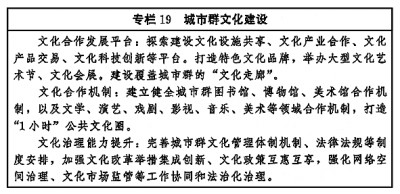 加強(qiáng)區(qū)域文化協(xié)同創(chuàng)新,健全合作互助、扶持補(bǔ)償機(jī)制,推動(dòng)?xùn)|部地區(qū)以創(chuàng)新引領(lǐng)文化發(fā)展,加大力度支持中西部地區(qū)以及東北等老工業(yè)基地文化發(fā)展,扶持革命老區(qū)、民族地區(qū)、邊疆地區(qū)文化發(fā)展,形成相互促進(jìn)、優(yōu)勢(shì)互補(bǔ)、融合互動(dòng)的區(qū)域文化發(fā)展格局。圍繞京津冀協(xié)同發(fā)展、長(zhǎng)江經(jīng)濟(jì)帶發(fā)展、粵港澳大灣區(qū)建設(shè)、長(zhǎng)三角一體化發(fā)展、黃河流域生態(tài)保護(hù)和高質(zhì)量發(fā)展等區(qū)域重大戰(zhàn)略,健全推進(jìn)區(qū)域內(nèi)文化協(xié)同發(fā)展機(jī)制,提升公共文化設(shè)施互聯(lián)互通水平,加強(qiáng)區(qū)域文化產(chǎn)業(yè)帶建設(shè),實(shí)現(xiàn)區(qū)域文化建設(shè)水平整體提高。促進(jìn)形成文化產(chǎn)業(yè)發(fā)展新格局,創(chuàng)新城市群文化一體化發(fā)展體制機(jī)制,共建高水平合作平臺(tái),加強(qiáng)公共文化服務(wù)便利共享。完善以城帶鄉(xiāng)、城鄉(xiāng)融合的文化發(fā)展體制機(jī)制,發(fā)揮城市帶動(dòng)輻射作用,加快城鄉(xiāng)間文化要素雙向流動(dòng),形成以點(diǎn)帶面、特色鮮明、優(yōu)勢(shì)互補(bǔ)、均衡配置的城鄉(xiāng)文化發(fā)展新格局。
