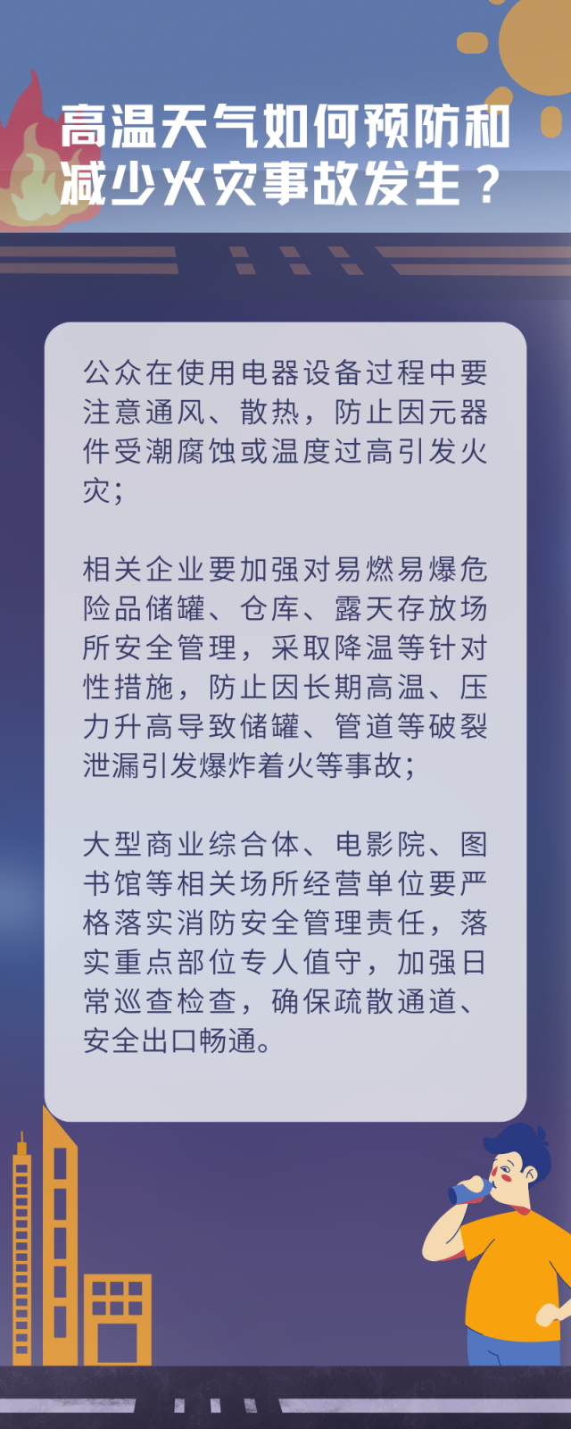 高溫天氣如何有效預(yù)防和減少火災(zāi)事故發(fā)生?應(yīng)急管理部消防救援局發(fā)布消防安全提示,公眾在使用電器設(shè)備過(guò)程中要注意通風(fēng)、散熱,防止因元器件受潮腐蝕或溫度過(guò)高引發(fā)火災(zāi);相關(guān)企業(yè)要加強(qiáng)對(duì)易燃易爆危險(xiǎn)品儲(chǔ)罐、倉(cāng)庫(kù)、露天存放場(chǎng)所安全管理,采取降溫等針對(duì)性措施,防止因長(zhǎng)期高溫、壓力升高導(dǎo)致儲(chǔ)罐、管道等破裂泄漏引發(fā)爆炸著火等事故;大型商業(yè)綜合體、電影院、圖書館等相關(guān)場(chǎng)所經(jīng)營(yíng)單位要嚴(yán)格落實(shí)消防安全管理責(zé)任,落實(shí)重點(diǎn)部位專人值守,加強(qiáng)日常巡查檢查,確保疏散通道、安全出口暢通。