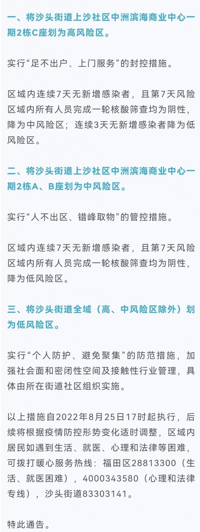 8月25日,廣東省深圳市福田區(qū)新型冠狀病毒肺炎疫情防控指揮部發(fā)布通告稱,根據(jù)當(dāng)前福田區(qū)疫情防控工作需要,按照國務(wù)院應(yīng)對(duì)新型冠狀病毒肺炎疫情聯(lián)防聯(lián)控機(jī)制綜合組《新型冠狀病毒肺炎疫情防控方案(第九版)》和《廣東省新冠肺炎本地疫情應(yīng)急處置方案(第五版)》相關(guān)規(guī)定,經(jīng)專家組研判,自2022年8月25日起,福田區(qū)在沙頭街道劃定高風(fēng)險(xiǎn)區(qū)、中風(fēng)險(xiǎn)區(qū)、低風(fēng)險(xiǎn)區(qū)如下: