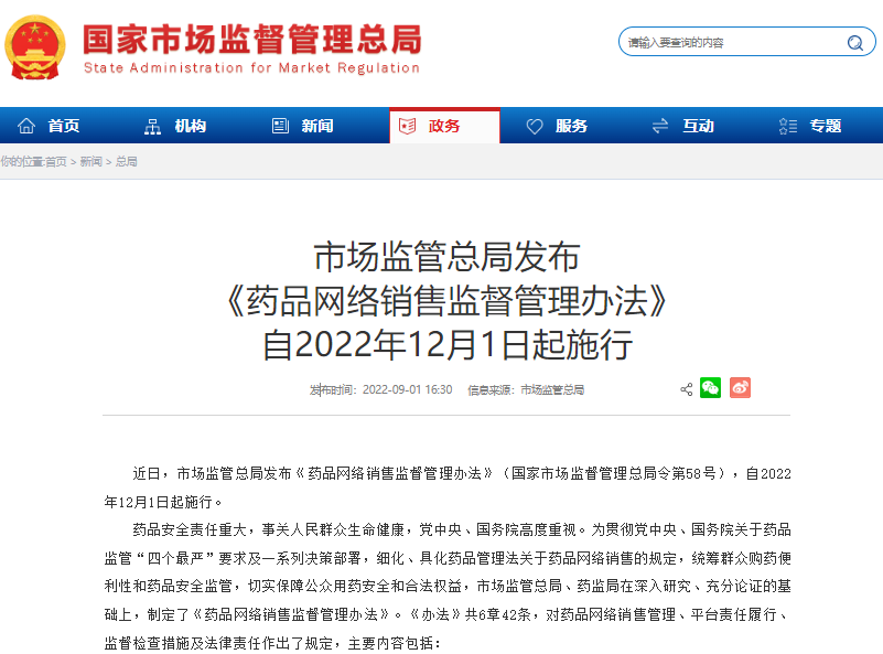 近日,市場監(jiān)管總局發(fā)布《藥品網(wǎng)絡(luò)銷售監(jiān)督管理辦法》(國家市場監(jiān)督管理總局令第58號),自2022年12月1日起施行。