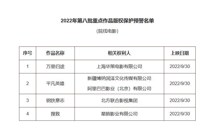 中新網(wǎng)9月30日電 據(jù)國家版權(quán)局29日消息,2022年度第八批重點作品版權(quán)保護預(yù)警名單公布,包含院線電影《萬里歸途》《平凡英雄》《鋼鐵意志》《搜救》。