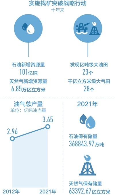 黨的十八大以來,我國(guó)油氣勘探開發(fā)力度不斷加大,高質(zhì)量發(fā)展體系日趨完善。油氣總產(chǎn)量由2012年的2.96億噸油當(dāng)量增長(zhǎng)至2021年的3.65億噸油當(dāng)量。今年前9月,原油產(chǎn)量達(dá)15375萬噸,同比增長(zhǎng)3.0%;天然氣產(chǎn)量達(dá)1601億立方米,同比增長(zhǎng)5.4%。