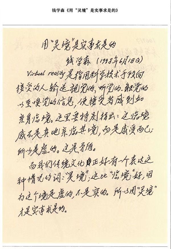 1998年6月18日,87歲的錢學(xué)森寫了一篇短文《用“靈境”是實事求是的》,其中寫道:“我們傳統(tǒng)文化正好有一個表達(dá)這種情況的詞‘靈境’;這比‘臨境’好,因為這個境是虛的,不是實的。”