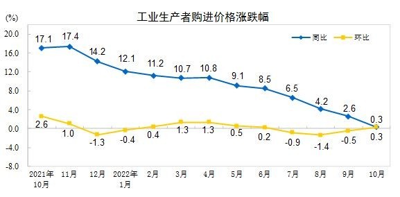 央視網(wǎng)消息:據(jù)國家統(tǒng)計(jì)局網(wǎng)站,2022年10月份,全國工業(yè)生產(chǎn)者出廠價(jià)格同比下降1.3%,環(huán)比上漲0.2%;工業(yè)生產(chǎn)者購進(jìn)價(jià)格同比上漲0.3%,環(huán)比上漲0.3%。1—10月平均,工業(yè)生產(chǎn)者出廠價(jià)格比去年同期上漲5.2%,工業(yè)生產(chǎn)者購進(jìn)價(jià)格上漲7.5%。