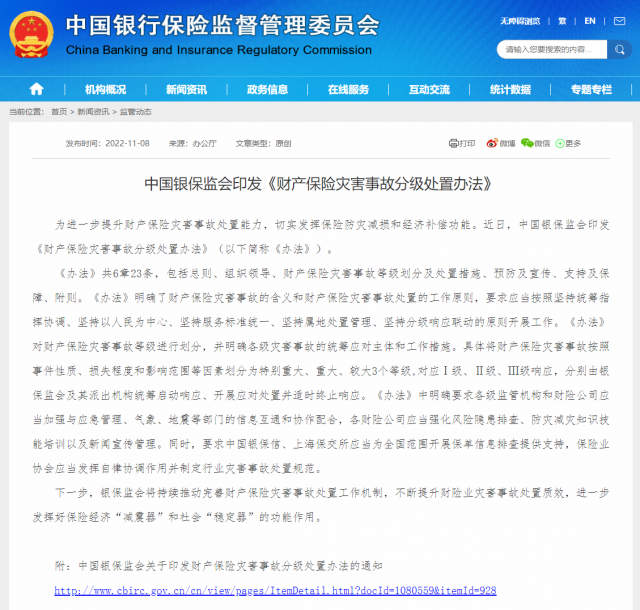 銀保監(jiān)會(huì)網(wǎng)站11月8日消息,為進(jìn)一步提升財(cái)產(chǎn)保險(xiǎn)災(zāi)害事故處置能力,切實(shí)發(fā)揮保險(xiǎn)防災(zāi)減損和經(jīng)濟(jì)補(bǔ)償功能。近日,中國銀保監(jiān)會(huì)印發(fā)《財(cái)產(chǎn)保險(xiǎn)災(zāi)害事故分級(jí)處置辦法》(以下簡稱《辦法》)。