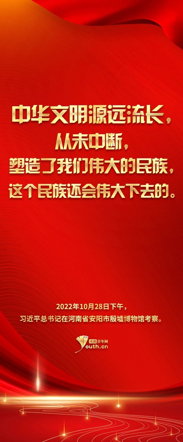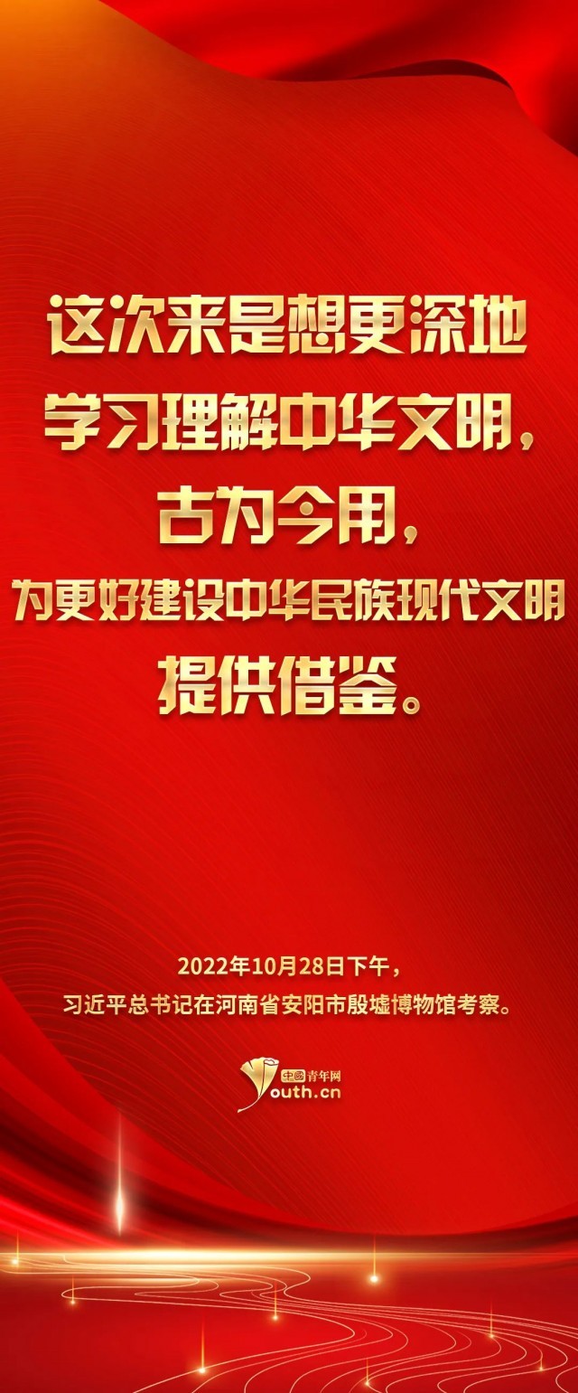 參天之木,必有其根;懷山之水,必有其源。習(xí)總書記的這次殷墟考察之行,讓我們將目光再次聚焦到中華民族的傳統(tǒng)文化之上。青山百代,仍蔭后人。正如習(xí)總書記指出的——中華優(yōu)秀傳統(tǒng)文化是我們黨創(chuàng)新理論的“根”,我們推進馬克思主義中國化時代化的根本途徑是“兩個結(jié)合”——民族要獨立自強,國家欲穩(wěn)步發(fā)展,文化是來自深處的支撐。作為當(dāng)代青年,我們理應(yīng)響應(yīng)時代號召,跟隨習(xí)近平總書記的腳步,去深入了解學(xué)習(xí)中華文明,兼顧歷史之沉淀與時代之新意,在向世界發(fā)揚中華氣象的同時,也邀得當(dāng)年之明月照徹今人。