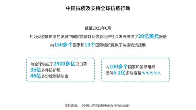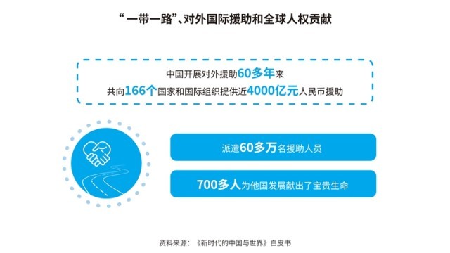 中國先后批準或加入了30余項國際人權文書,其中包括6項聯(lián)合國核心人權條約;累計共向166個國家和國際組織提供了援助,派遣60多萬名援助人員;多次無條件免除重債窮國和最不發(fā)達國家對華到期政府無息貸款債務。在聯(lián)合國維和行動中,中國是安理會常任理事國第一大出兵國,30多年來累計派出維和官兵5萬余人次。共建“一帶一路”已成為助力各國發(fā)展、深受世界歡迎的新興國際公共產品,據世界銀行研究報告,到2030年,將使相關國家760萬人擺脫極端貧困、3200萬人擺脫中度貧困。新冠肺炎疫情暴發(fā)以來,中國努力促進新冠疫苗在全球范圍內公平合理分配,成為全球對外提供疫苗數量最多的國家。