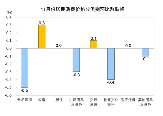 11月份,全國(guó)居民消費(fèi)價(jià)格環(huán)比下降0.2%。其中,城市下降0.2%,農(nóng)村下降0.2%;食品價(jià)格下降0.8%,非食品價(jià)格持平;消費(fèi)品價(jià)格下降0.1%,服務(wù)價(jià)格下降0.2%。