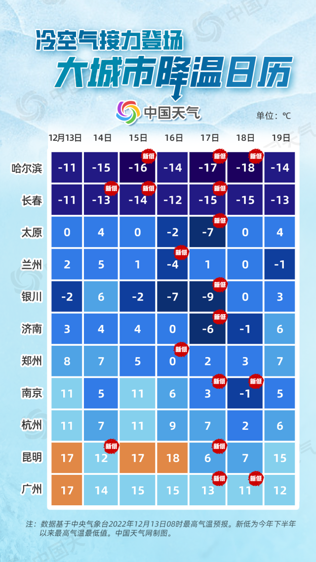 本周兩股冷空氣接連影響我國,冷上加冷。除了目前正在影響我國的雙十二冷空氣,一股實(shí)力更強(qiáng)的冷空氣蓄勢(shì)待發(fā),它將于12月15日至18日影響我國大部,降溫影響直達(dá)華南、云南一帶,南方多地最低氣溫或可破極值,冷過11月底的寒潮。中國天氣網(wǎng)推出大城市降溫日歷,快來看看你家氣溫何時(shí)降到低點(diǎn),請(qǐng)大家及時(shí)備好保暖衣物,謹(jǐn)防感冒。