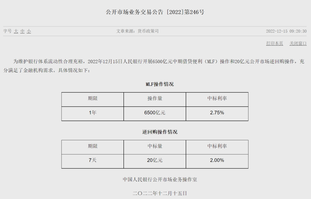 為維護銀行體系流動性合理充裕,12月15日中國人民銀行開展6500億元中期借貸便利(MLF)操作和20億元公開市場逆回購操作,充分滿足了金融機構(gòu)需求,中標(biāo)利率均與前次持平。