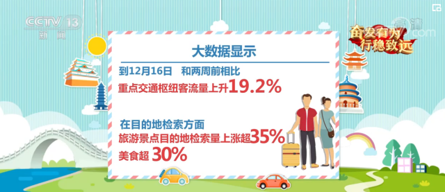 防控措施的優(yōu)化讓不少城市的人間“煙火氣”悄然回歸。大數(shù)據(jù)顯示,到12月16日,和兩周前相比,重點(diǎn)交通樞紐客流量上升19.2%。在目的地檢索方面,旅游景點(diǎn)目的地檢索量上漲超35%、美食超30%。