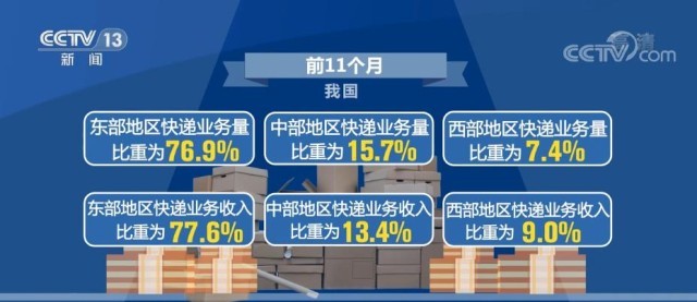 前11個月,我國東、中、西部地區(qū)快遞業(yè)務(wù)量比重分別為76.9%、15.7%和7.4%,業(yè)務(wù)收入比重分別為77.6%、13.4%和9.0%。與去年同期相比,東部地區(qū)快遞業(yè)務(wù)量比重下降1.3個百分點(diǎn),快遞業(yè)務(wù)收入比重下降0.6個百分點(diǎn)。中部地區(qū)快遞業(yè)務(wù)量比重上升1.2個百分點(diǎn),快遞業(yè)務(wù)收入比重上升0.5個百分點(diǎn)。西部地區(qū)快遞業(yè)務(wù)量比重上升0.1個百分點(diǎn),快遞業(yè)務(wù)收入比重上升0.1個百分點(diǎn)。