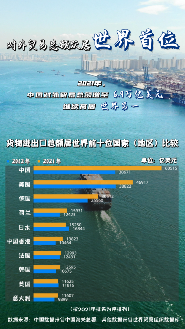2020年中國對外貿(mào)易總額由2012年的4.4萬億美元升至5.3萬億美元,首超美國成為全球第一大貿(mào)易國。2021年,中國對外貿(mào)易總額加快上升增至6.9萬億美元,繼續(xù)高居世界第一。在經(jīng)濟全球化頻遭單邊主義、保護主義等“逆流”襲擾的歷史當口,中國從融入和適應全球化走向推動和引領全球化,積極倡導建設開放型世界經(jīng)濟,推動經(jīng)濟全球化朝著更加開放、包容、普惠、平衡、共贏方向發(fā)展。目前,中國已成為140多個國家和地區(qū)的主要貿(mào)易伙伴,形成更大范圍、更寬領域、更深層次對外開放格局。