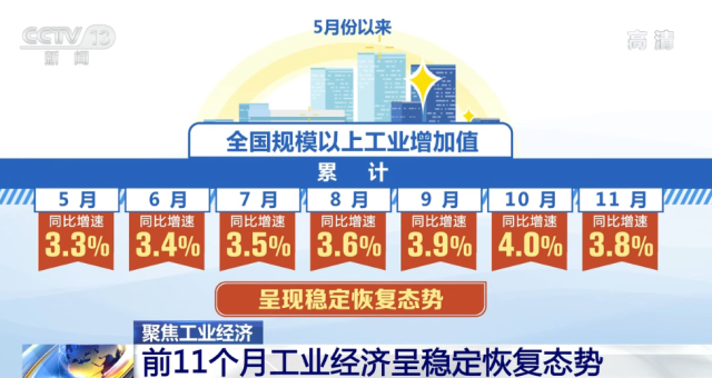 央視網(wǎng)消息:工業(yè)是經(jīng)濟增長的主體和引擎,振作工業(yè)經(jīng)濟是穩(wěn)住經(jīng)濟大盤的堅實支撐。最新數(shù)據(jù)顯示,今年前11個月,全國規(guī)模以上工業(yè)增加值同比增長3.8%。自5月份以來,同比增速持續(xù)提升,呈現(xiàn)穩(wěn)定恢復(fù)態(tài)勢,有力支撐了國民經(jīng)濟平穩(wěn)運行。