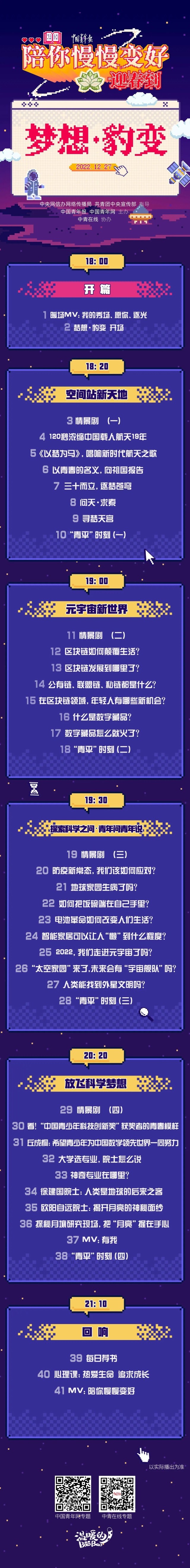 在這場(chǎng)聯(lián)播節(jié)目中,4位年輕記者將通過(guò)自己的經(jīng)歷和故事,和大家一起回顧2022年與科技創(chuàng)新有關(guān)的瞬間,重溫那些帶給我們“夢(mèng)想”和“豹變”的激情時(shí)刻。聯(lián)播由空間站新天地、元宇宙新世界、探索科學(xué)之問(wèn)、放飛科學(xué)夢(mèng)想等四大篇章組成,重磅環(huán)節(jié)“探索科學(xué)之問(wèn)”將聯(lián)合北京市科協(xié),共同推出聯(lián)名款“青年問(wèn)青年說(shuō)”,青年科學(xué)家和大學(xué)生一起盤(pán)點(diǎn)這些熱點(diǎn)科技問(wèn)題:防疫新常態(tài),我們?cè)撊绾螒?yīng)對(duì)?極端天氣頻發(fā),地球家園生病了?2022年,我們走進(jìn)元宇宙了嗎?“太空家園”來(lái)了,未來(lái)會(huì)不會(huì)有“宇宙艦隊(duì)”…… 12月27日,我們不見(jiàn)不散。