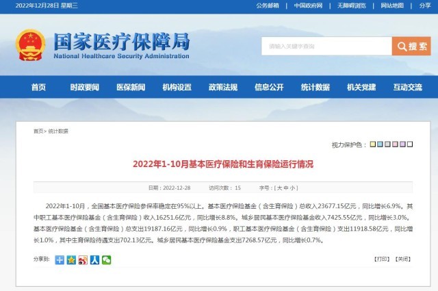 央視網(wǎng)消息:國家醫(yī)療保障局網(wǎng)站12月28日消息,2022年1-10月,全國基本醫(yī)療保險參保率穩(wěn)定在95%以上。基本醫(yī)療保險基金(含生育保險)總收入23677.15億元,同比增長6.9%。其中職工基本醫(yī)療保險基金(含生育保險)收入16251.6億元,同比增長8.8%。城鄉(xiāng)居民基本醫(yī)療保險基金收入7425.55億元,同比增長3.0%。基本醫(yī)療保險基金(含生育保險)總支出19187.16億元,同比增長0.9%,職工基本醫(yī)療保險基金(含生育保險)支出11918.58億元,同比增長1.0%,其中生育保險待遇支出702.13億元。城鄉(xiāng)居民基本醫(yī)療保險基金支出7268.57億元,同比增長0.7%。