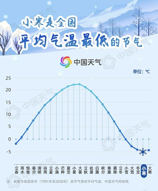據(jù)中國天氣網(wǎng)氣象分析師王偉躍介紹,小寒節(jié)氣冷空氣活動(dòng)頻繁,氣溫下降明顯,北方天寒地凍,滴水成冰,南方霜雪交加,冷透肌骨。氣象數(shù)據(jù)顯示,小寒是二十四節(jié)氣中全國平均氣溫最低的節(jié)氣,僅-5.1℃;其次是大寒節(jié)氣,達(dá)-4.5℃。