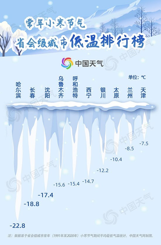 從中國天氣網(wǎng)1991-2020年小寒節(jié)氣省會(huì)級(jí)城市低溫排行榜可以看出,上榜的均為北方城市,其中哈爾濱以-22.8℃位列榜首,長春和沈陽分別位居第二、第三。
