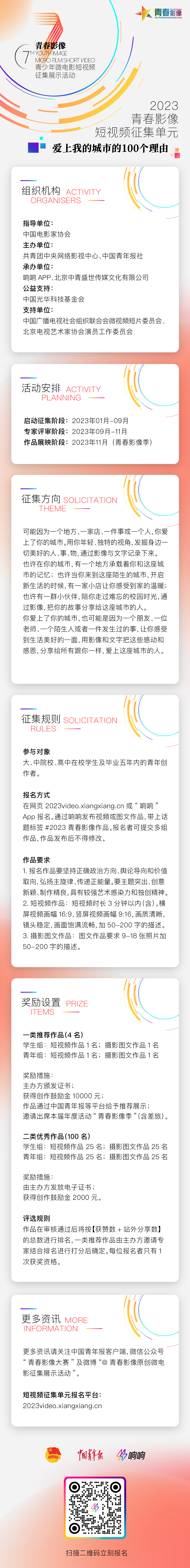 2022年12月31日,在中國(guó)電影家協(xié)會(huì)的指導(dǎo)下,由共青團(tuán)中央網(wǎng)絡(luò)影視中心、中國(guó)青年報(bào)社、珠海奇妙科技有限公司等單位組織開(kāi)展的第七屆青春影像——“愛(ài)上我的城市的100個(gè)理由”短視頻征集單元正式啟動(dòng)!