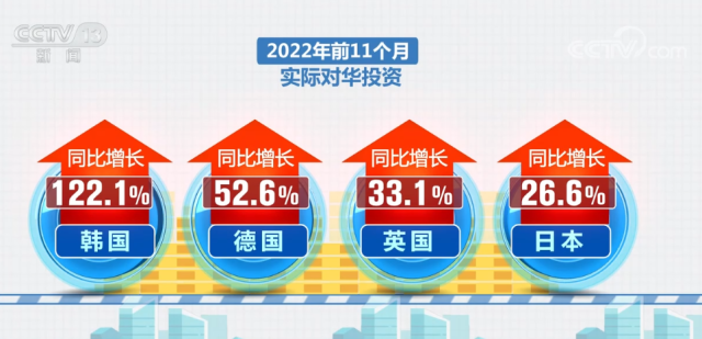 2022年前9個(gè)月,中國吸收外資規(guī)模就達(dá)到1萬億元;前11個(gè)月,突破1.15萬億元,超過2021年全年水平;與此同時(shí),外資來源更加多元。2022年前11個(gè)月,韓國、德國、英國、日本等國家的實(shí)際對(duì)華投資同比分別增長122.1%、52.6%、33.1%和26.6%。