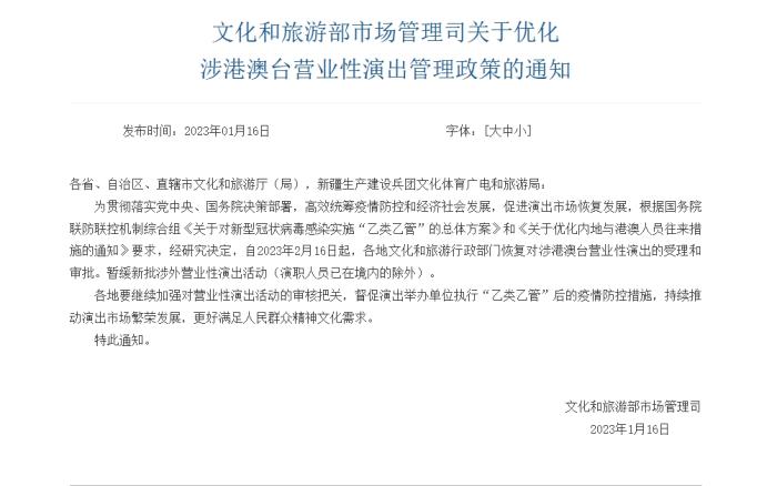 《通知》提到,根據(jù)國(guó)務(wù)院聯(lián)防聯(lián)控機(jī)制綜合組《關(guān)于對(duì)新型冠狀病毒感染實(shí)施“乙類乙管”的總體方案》和《關(guān)于優(yōu)化內(nèi)地與港澳人員往來(lái)措施的通知》要求,經(jīng)研究決定,自2023年2月16日起,各地文化和旅游行政部門恢復(fù)對(duì)涉港澳臺(tái)營(yíng)業(yè)性演出的受理和審批。暫緩新批涉外營(yíng)業(yè)性演出活動(dòng)(演職人員已在境內(nèi)的除外)。