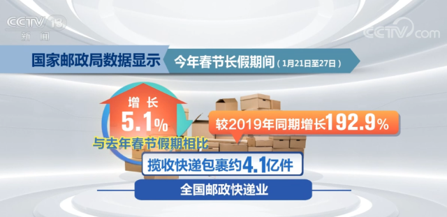 國家郵政局數(shù)據(jù)顯示,今年春節(jié)長假期間(1月21日至27日),全國郵政快遞業(yè)攬收快遞包裹約4.1億件,與去年春節(jié)假期相比增長5.1%,較2019年同期增長192.9%;投遞快遞包裹3.3億件,與去年春節(jié)假期相比增長10.0%,較2019年同期增長254.8%。