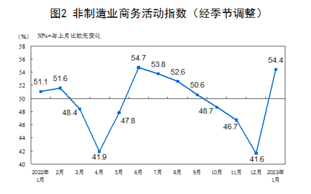 1月份,非制造業(yè)商務(wù)活動(dòng)指數(shù)為54.4%,比上月上升12.8個(gè)百分點(diǎn),重返擴(kuò)張區(qū)間,非制造業(yè)景氣水平觸底回升。