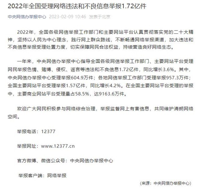 2022年全國受理網(wǎng)絡違法和不良信息舉報1.72億件