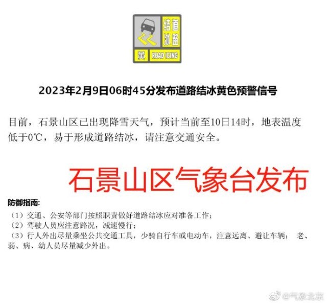 另外,目前石景山、門頭溝、延慶區(qū)氣象臺已發(fā)布道路結冰黃色預警信號,上述區(qū)域已出現(xiàn)降雪,易形成道路結冰,請大家出行注意交通安全。
