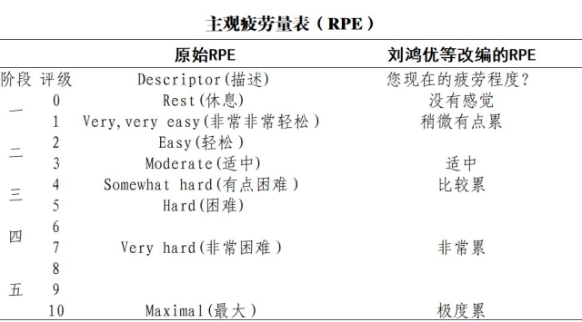使用主觀疲勞感知評(píng)估量表,作為逐步提高活動(dòng)水平的指南。該量表是世界衛(wèi)生組織在《新冠病毒相關(guān)疾病康復(fù)指導(dǎo)手冊(cè)》對(duì)感染后患者通過(guò)記錄日?;顒?dòng)以及主觀疲勞量表評(píng)分(RPE值)來(lái)監(jiān)控自身的狀況,并用于指導(dǎo)如何提高自身活動(dòng)水平的量表。該量表將運(yùn)動(dòng)中主觀感受的費(fèi)力程度劃分為0分(完全不費(fèi)力)到10分(最大程度的用力),即RPE值0~10分。