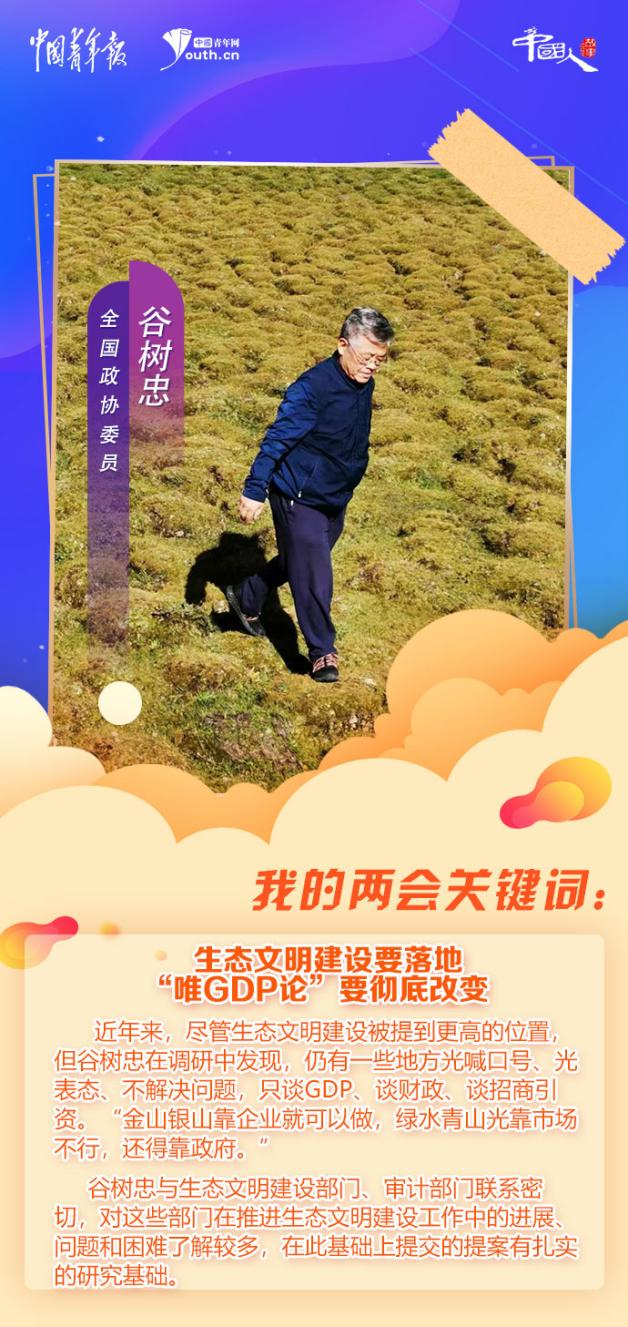 近年來,盡管生態(tài)文明建設(shè)被提到更高的位置,但谷樹忠在調(diào)研中發(fā)現(xiàn),仍有一些地方光喊口號、光表態(tài)、不解決問題,只談GDP、談財政、談?wù)猩桃Y。“金山銀山靠企業(yè)就可以做,綠水青山光靠市場不行,還得靠政府。”