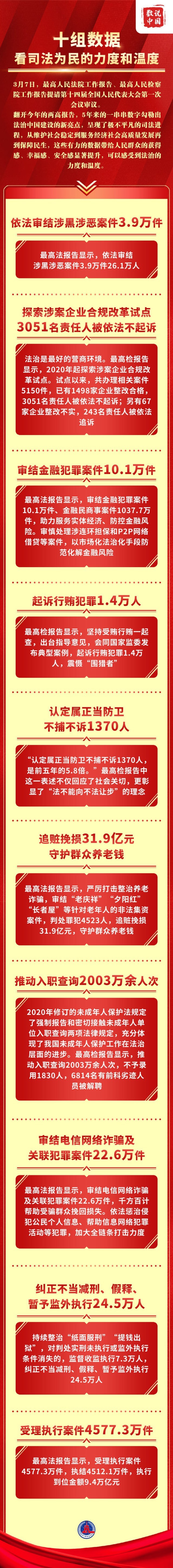 翻開今年的兩高報告,5年來的一串串數(shù)字勾勒出法治中國建設的新亮點,呈現(xiàn)了極不平凡的司法進程,從維護社會穩(wěn)定到服務經(jīng)濟社會高質量發(fā)展再到保障民生,這些有力的數(shù)據(jù)帶給人民群眾的獲得感、幸福感、安全感顯著提升,可以感受到法治的力度和溫度。
