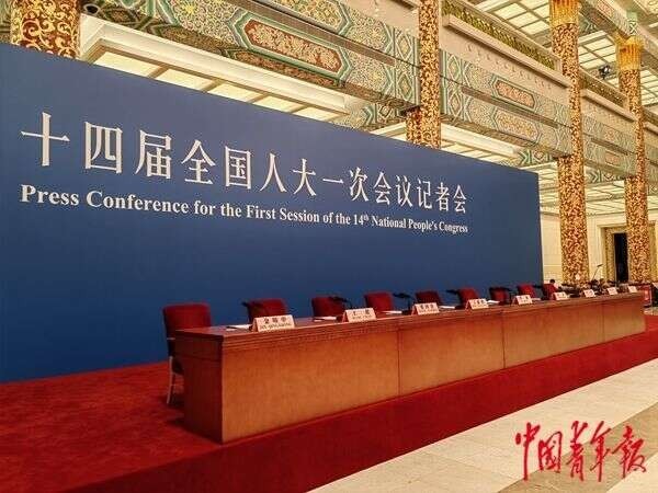 記者會(huì)現(xiàn)場(chǎng)沒(méi)有擺放鮮花綠植,主席臺(tái)未鋪設(shè)臺(tái)布,藍(lán)色背景板上寫(xiě)著白色大字:十四屆全國(guó)人大一次會(huì)議記者會(huì)。9把紅色靠背的椅子,正在等待今天記者會(huì)的主角。