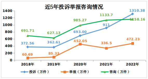 市場監(jiān)管總局今天發(fā)布數(shù)據(jù)顯示,2022年,全國市場監(jiān)管部門通過全國12315平臺、電話、傳真、窗口等渠道共受理消費者投訴、舉報和咨詢2940.77萬件,同比增長23.5%。其中,投訴1310.38萬件,舉報472.23萬件,為消費者挽回經(jīng)濟損失45.19億元,有力保護了消費者合法權(quán)益。