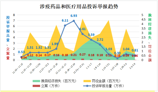 “二十條”和“新十條”出臺后,疫情防控重心從防控感染轉(zhuǎn)到醫(yī)療救治,2022年11月10日至2022年底,全國12315平臺接收相關(guān)投訴舉報24.11萬件,同比增長3.88倍,環(huán)比增長2.95倍,最高峰值達到19.5倍。其中,投訴14.18萬件,舉報9.93萬件,挽回經(jīng)濟損失498.17萬元。