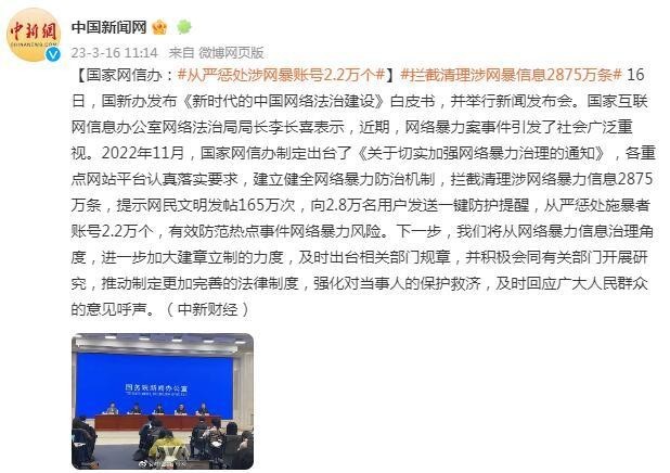 國家網(wǎng)信辦:攔截清理涉網(wǎng)絡暴力信息2875萬條,從嚴懲處涉網(wǎng)暴賬號2.2萬個