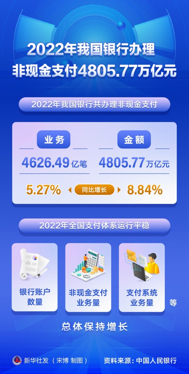 2022年我國(guó)銀行辦理非現(xiàn)金支付4805.77萬億元