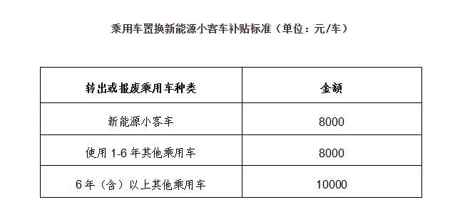 方案指出,報廢或轉(zhuǎn)出新能源小客車的,每車給予8000元補貼;報廢或轉(zhuǎn)出使用1-6年其他類型乘用車(非新能源)的,每車給予8000元補貼;報廢或轉(zhuǎn)出使用6年(含)以上其他乘用車的,每車給予10000元補貼。