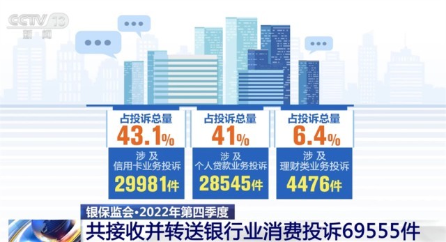 2022年第四季度,中國銀保監(jiān)會及其派出機(jī)構(gòu)共接收并轉(zhuǎn)送銀行業(yè)消費(fèi)投訴69555件。其中,涉及信用卡業(yè)務(wù)投訴29981件,占投訴總量的43.1%;涉及個(gè)人貸款業(yè)務(wù)投訴28545件,占投訴總量的41%;涉及理財(cái)類業(yè)務(wù)投訴4476件,占投訴總量的6.4%。