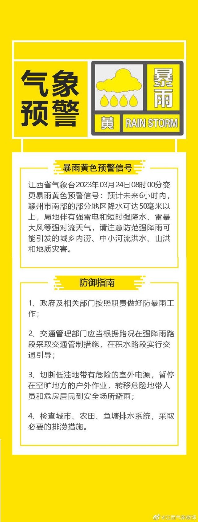 江西省氣象臺(tái)2023年03月24日08時(shí)00分變更暴雨黃色預(yù)警信號(hào):預(yù)計(jì)未來(lái)6小時(shí)內(nèi),贛州市南部的部分地區(qū)降水可達(dá)50毫米以上,局地伴有強(qiáng)雷電和短時(shí)強(qiáng)降水、雷暴大風(fēng)等強(qiáng)對(duì)流天氣,請(qǐng)注意防范強(qiáng)降雨可能引發(fā)的城鄉(xiāng)內(nèi)澇、中小河流洪水、山洪和地質(zhì)災(zāi)害。