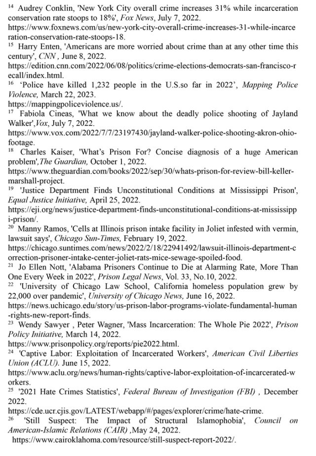 執(zhí)法司法領(lǐng)域種族歧視根深蒂固。聯(lián)合國(guó)消除種族歧視委員會(huì)的結(jié)論性報(bào)告指出,美國(guó)執(zhí)法人員對(duì)有色人種和少數(shù)族裔群體過(guò)度使用暴力并逍遙法外的情況仍然普遍存在;有色人種和少數(shù)族裔在美國(guó)司法系統(tǒng)中被逮捕、監(jiān)禁和長(zhǎng)期虐待的情況突出。(注73)“警察暴力地圖”網(wǎng)站的數(shù)據(jù)顯示,在2013年至2022年的警察殺人事件中,非洲裔被警察殺害的可能性是白人的2.78倍,手無(wú)寸鐵的非洲裔被警察殺害的可能性是手無(wú)寸鐵的白人的1.3倍。在波士頓、明尼阿波利斯和芝加哥,非洲裔被警察殺害的可能性更是白人的20多倍。(注74)美國(guó)國(guó)家公共電臺(tái)2022年9月27日?qǐng)?bào)道,國(guó)家免責(zé)登記處發(fā)布的報(bào)告指出,非洲裔在美國(guó)人口中所占比例不到14%,但在美國(guó)被誤判犯有嚴(yán)重罪行并在至少服完部分刑期后獲釋的所有人中,非洲裔占了53%;美國(guó)非洲裔因三項(xiàng)重大罪行被錯(cuò)誤定罪的可能性是白人的7倍,非洲裔因毒品犯罪被錯(cuò)誤定罪的可能性是其他人的19倍。(注75)美國(guó)國(guó)家學(xué)院出版的《美國(guó)監(jiān)禁的增長(zhǎng):探索原因和后果》一書指出,滲透著種族主義的刑事司法系統(tǒng)“正日益成為一個(gè)更大的污名化和長(zhǎng)期邊緣化系統(tǒng)的主要通道”。(注76)